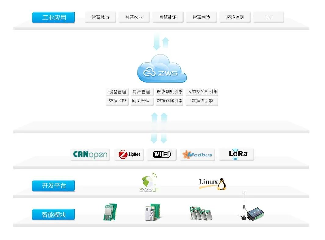 致远电子的愿景是成为工业物联网生态系统领导企业,采用“芯片+AWorksOS开发平台”设计高附加值的模块、板卡和高端测量仪器,通过有线和无线接口,接入ZWS IoT-PaaS云端,实现大数据处理,构成工业互联网生态系统。ZWS IoT-PaaS云平台支持多种协议的设备快速接入,支持数据透传转发以及完善的二次开发包,支持全私有化部署,并提供功能丰富的后台MIS系统进行设备统一管理,为客户的核心需求提供一站式的解决方案。